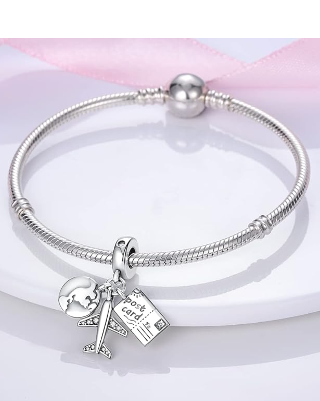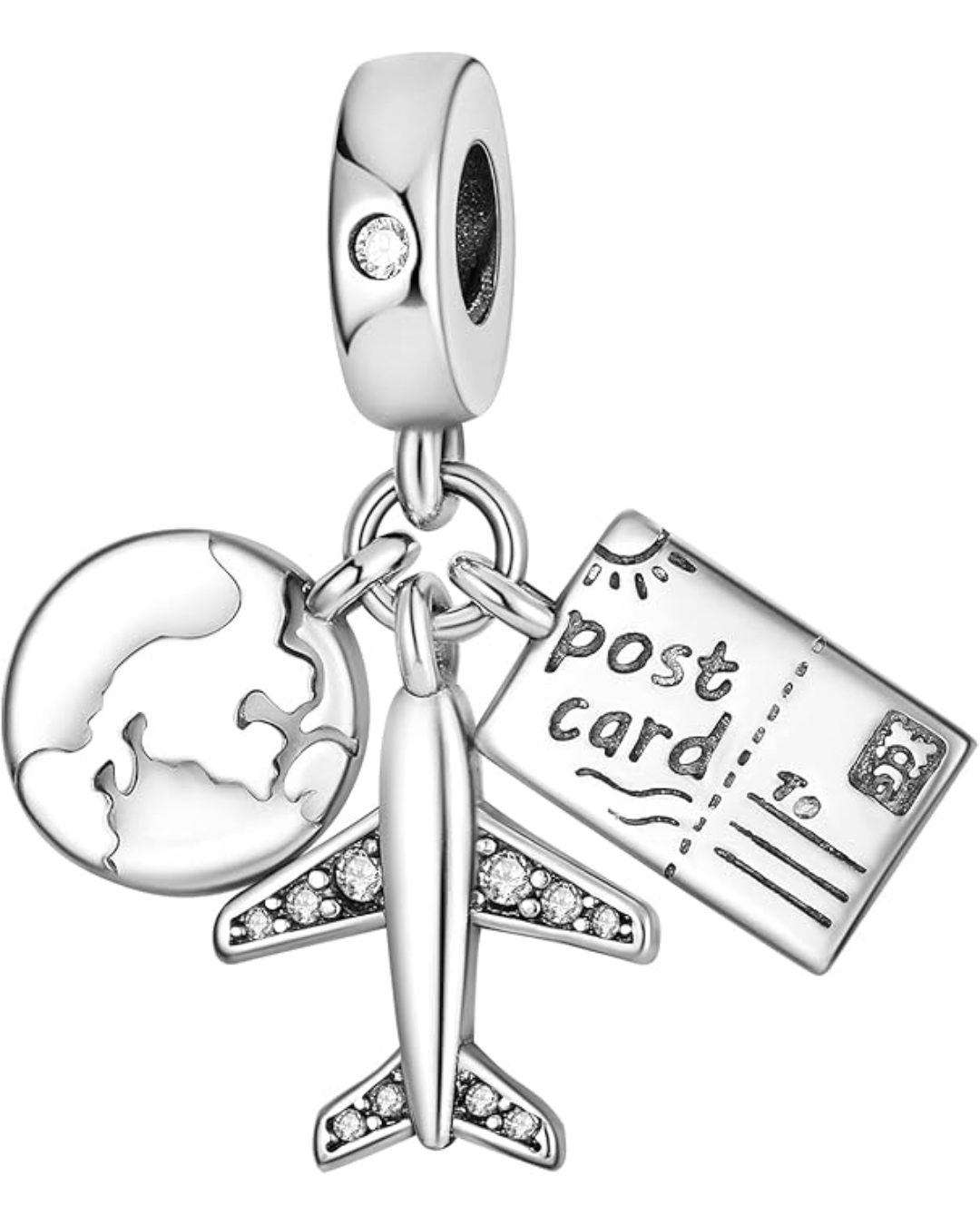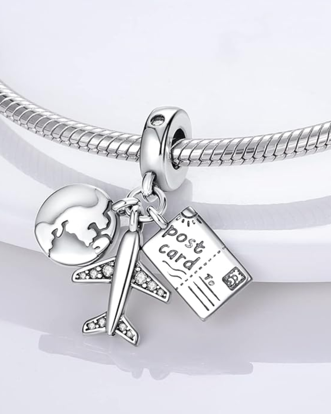 El dije de avión, planeta y pasaporte en el contexto de viajes, simboliza el deseo de explorar el mundo, la pasión por viajar y la conexión con diferentes culturas